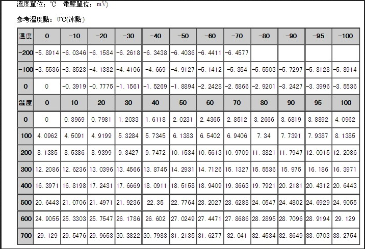 K型熱電偶不同溫度對應(yīng)的電壓值,豎排是百進(jìn)位溫度,橫排是10進(jìn)位溫度,比如找260度的電壓值,先在豎排找到200度的檔, 再水平找到60度對應(yīng)的位置,10.5613就是260度對應(yīng)的電壓值。 K型熱電偶分度表![]()